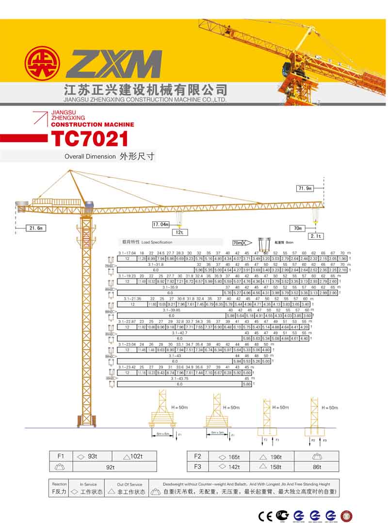 2、最大工作幅70米,最大起重量12噸,末端最大起重量2.1噸,額定起重力矩2500KN.M;